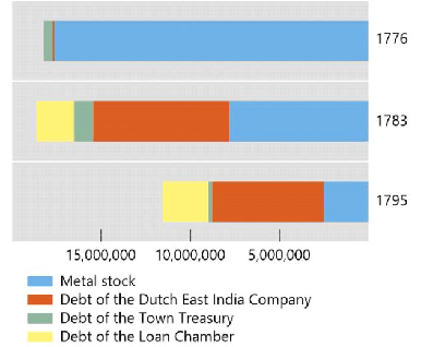 在基于账户的货币的创建和管理方式上,阿姆斯特丹银行与"稳定币"十分相似。存款的价值由资产支持来维持。因此,基于账户的货币不仅可作为账户单位和支付手段,而且可以作为价值储存。170年来,非常成功的阿姆斯特丹银行拥有绝对安全的资产负债表,负债几乎完全由金属库存支撑(见下图,顶柱蓝色)。该行的良好声誉使该银行在通过透支向市场参与者提供流动性援助时,不时偏离其章程。然而,在1770年代后期,它向最大的客户荷兰东印度公司贷款越来越多,从而进一步偏离了章程。随着其信誉的逐渐消失,以及其(储备)支持的质量(见上图,中间柱蓝色)逐渐消失,公众对其基于账户的货币的信任也逐渐消失。结果1795 年的挤兑导致银行崩溃(参见图中的下柱蓝色)。
