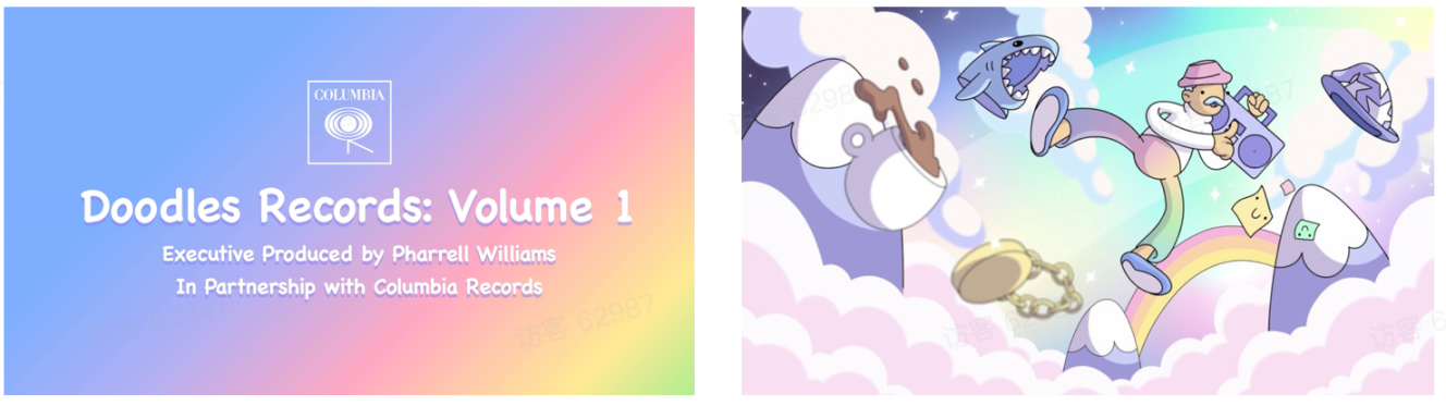 今年 Doodles 成立 Doodles 唱片的新部门,并与哥伦比亚唱片公司合作推出了纪录片《Doodles Records: Volume 1》的相关音乐专辑(Pharrell 执行制作,Scott Martin 负责画风设计),通过对音乐领域的进军,Doodles 完成 NFT 的音频和视觉的结合,比如 Doodles 2 的用户也将能够把音乐分层到他们新的动画 NFT 中。