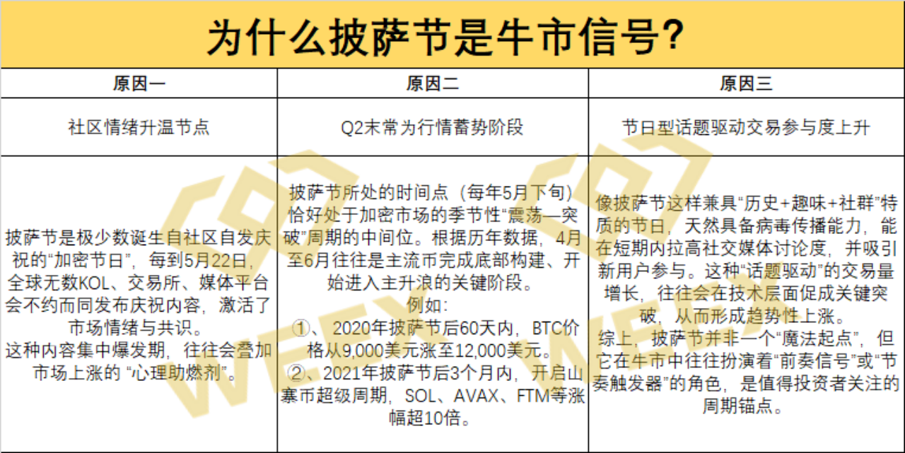 比特币披萨节(5月22日)纪念了2010年首次用比特币交易实物的历史性事件,并成为观察比特币牛市节奏的重要窗口。历史数据显示,披萨节后的几个月常常是价格上涨的关键时期。2025年市场受ETF资金流入、美联储宽松预期等宏观因素推动,或仍处于牛市中后段,顶部可能在6-9个月后。