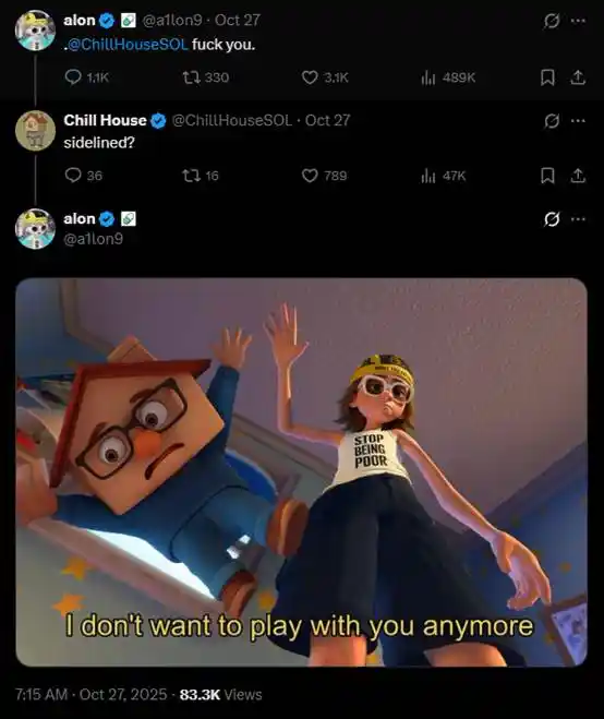 然后 alon 登场,上来就开大,「我操你的 Chillhouse」。Chillhouse 回复,「踏空了?」,alon 则以一张「我再也不想跟你玩耍」了的图片回应。
