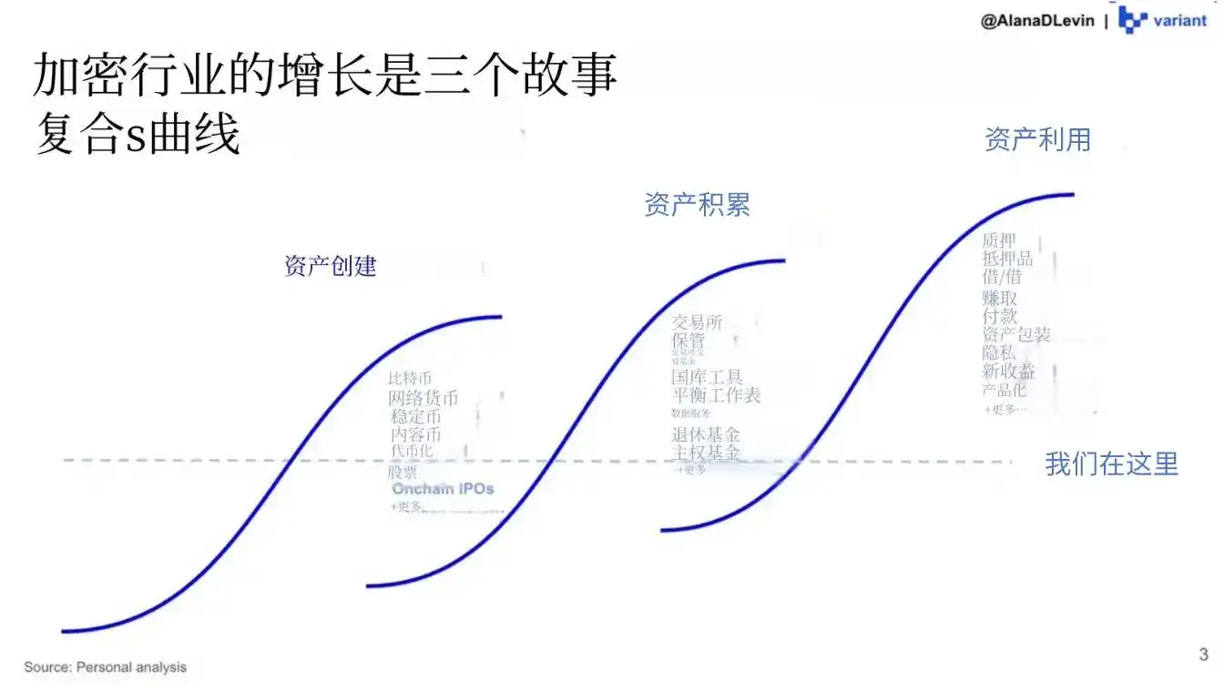 报告将加密行业的增长描绘为三个复合的 S 曲线故事:资产创造、资产积累和资产利用。