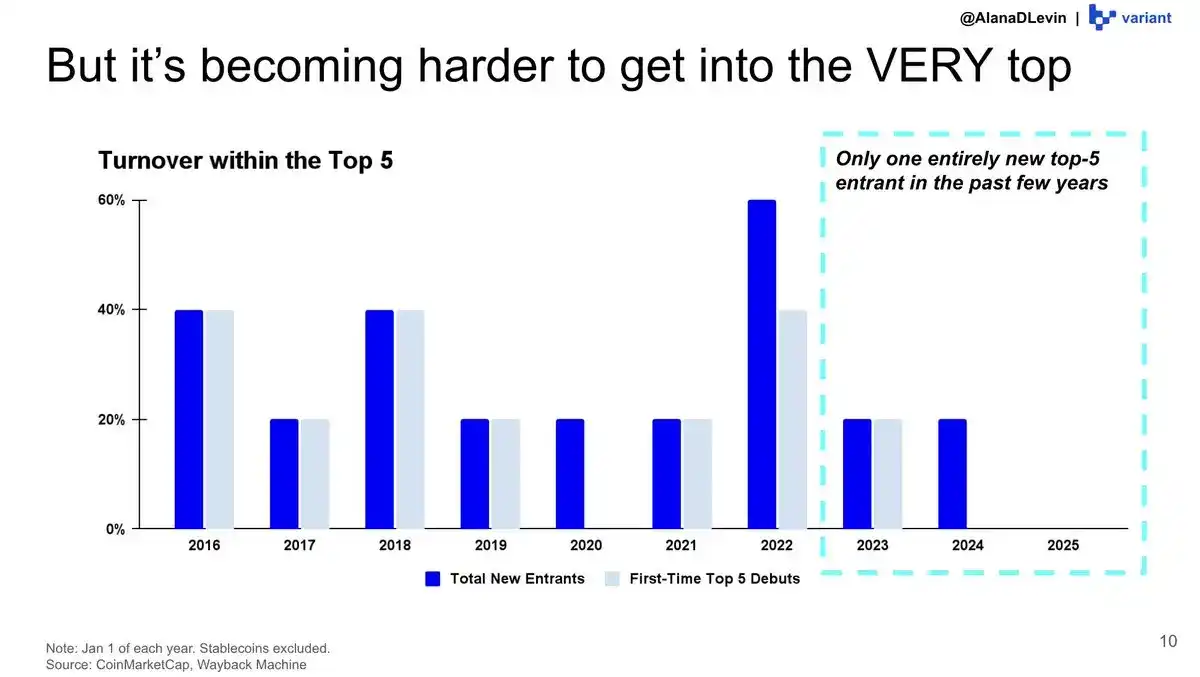 这一趋势在前五大加密资产中尤为明显——过去几年几乎没有新的资产进入这一梯队。