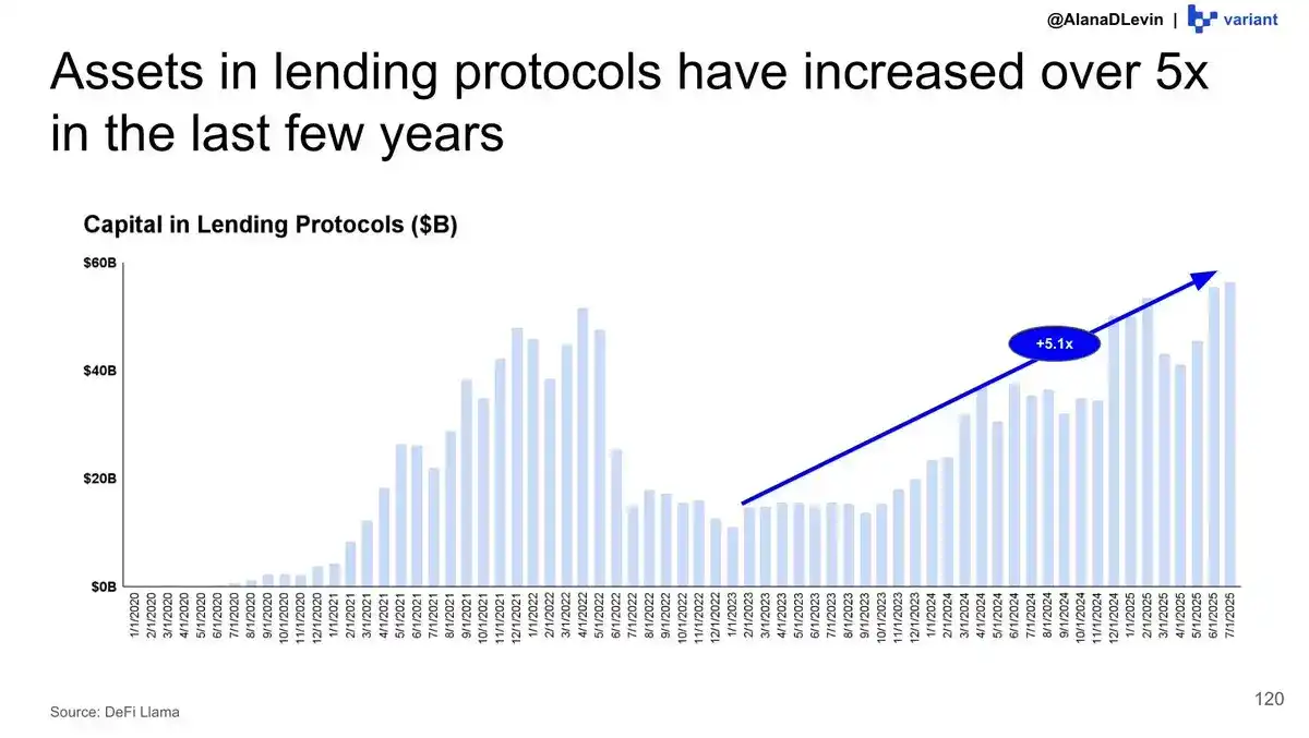 另一个可以观察到资产利用早期迹象的领域是链上借贷。借贷协议中的资产(如 @Morpho)在过去几年增长了 5 倍以上,并且仍在持续增长!