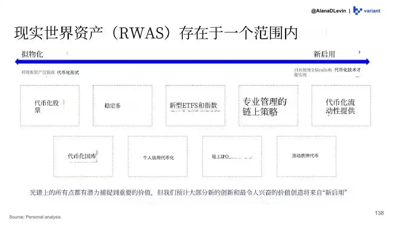 最终,“RWA”(实物资产,Real World Assets)这一术语将扩展,涵盖比现今更广泛的产品类型和代币构建方式。这些新资产不仅自身具有价值,还将催化新一轮的资产积累与利用需求。