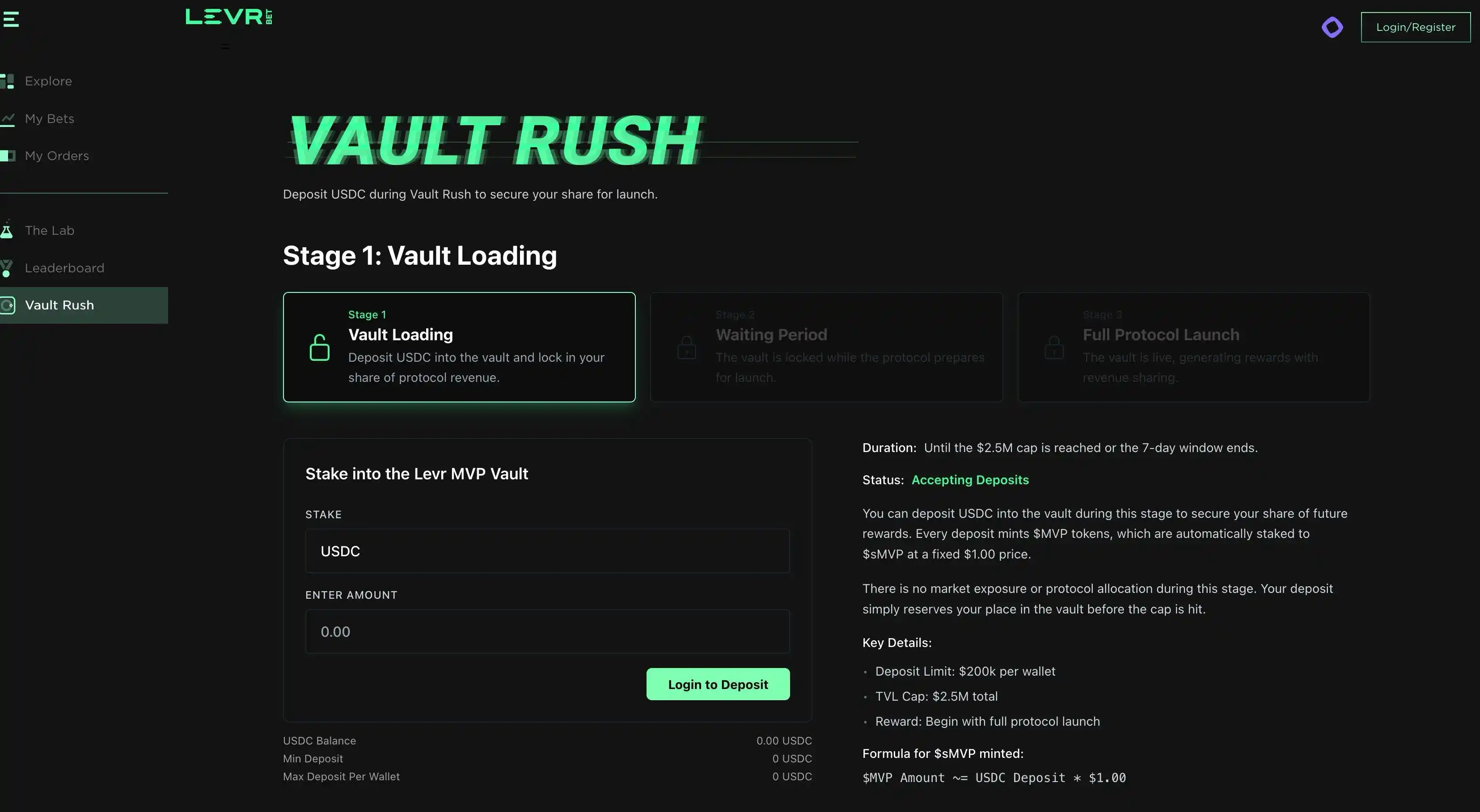 Levr.Bet 是体育板块的预测市场平台,允许玩家对比赛进行高额杠杆投注(例如,最高可将投注额放大 5 倍)。目前,它为用户提供了一个独特的「成为庄家」的机会。用户无需下注,而是可以存入资金来支持投注池,从而获得平台的部分手续费和利润分成,平台参与方法如下: