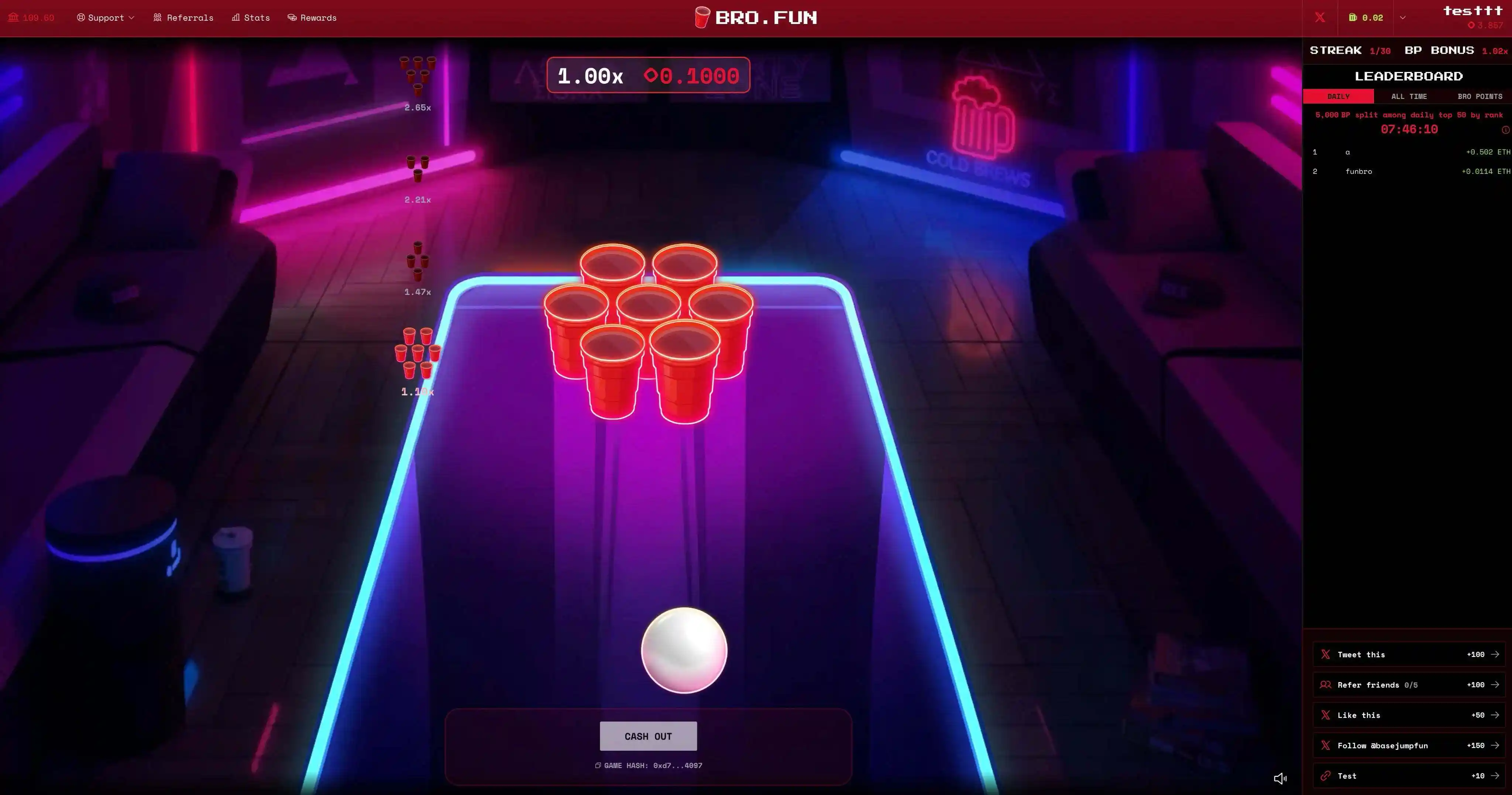 bro.fun 是一款派对游戏「啤酒乒乓」的数字化版本,用户可以用代币下注,有机会赢取倍增奖金。它采用「公平引擎」确保每次投掷都随机且透明,为用户提供了一种有趣且防作弊的方式来测试自己的运气和投掷技巧,基础游戏玩法如下: