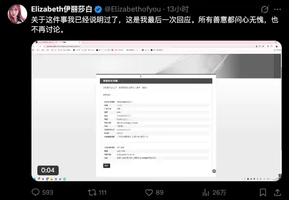 面对铺天盖地的质疑,伊丽莎白于 1 日晚发布视频回应。她在视频中坚称自己「已捐款,问心无愧」,并表示这是最后一次回应,随后展示了另一张截图。