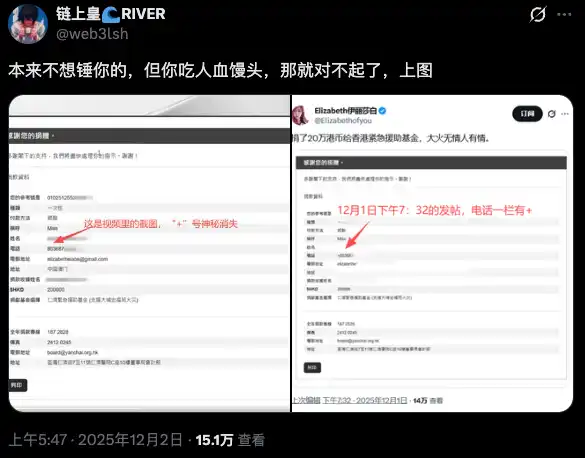 12 月 1 日,拥有 13 万粉丝的加密货币领域 KOL 伊丽莎白在社交平台 X(原 Twitter)发布推文,称向仁济医院捐款 20 万港币以支援大埔火灾受害者。推文附带了转账确认截图,并配文呼吁「大火无情人有情」,善举迅速获得了超过 60 万的浏览量和 1500 次点赞,一度被视为行业正能量的体现。